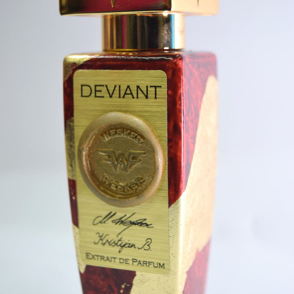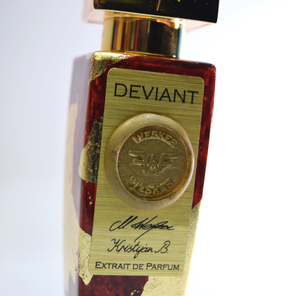 Ogni flacone di Wesker Deviant è meticolosamente realizzato a mano, con una superficie ceramica liquida marmorizzata e decorata con fini foglie d'oro. Questo processo artigianale rende ogni flacone unico, trasformandolo in un vero e proprio pezzo da collezione.